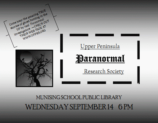 Home Announcements Upper Peninsula Paranormal Research Society To Speak At Libary Announcements Upper Peninsula Paranormal Research Society To Speak At Libary By WorkerBee - September 1, 2011 12 Munising, Michigan – On Wednesday, September 14, 2011 at 6 p.m. a program by the Upper Peninsula Paranormal Research Society at the Munising Public Libarry will share their experiences investigating supernatural events throughout the UP. Upper Peninsula Paranormal Investigators Speak