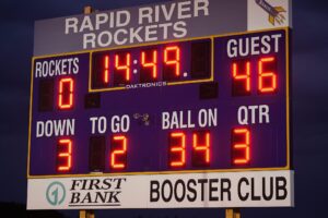 The first quarter saw big defensive plays in the opening by the Mustangs’ Logan Gould, Joe Kelley, Micaiah Peramaki, Blake Walther, Kane Nebel, and Jesse Matson, Josiah Peramaki, and Reagan Bowerman. On offense, the Mustangs had a strong opening with big plays from Nebel and Micaiah Peramaki, gaining a touchdown on the first drive out. Reagan Bowerman made a big tackle on special teams. Nebel made an interception. Nebel and Paramaki continued to be a great combination on the field. Cully Trzeciak picked up a two point conversion to bring the game to 14-0 Mustangs. Tyler Moore and Peramaki made big defensive plays to force a Rockets punt. Nebel made big plays in the following drive including a long run and a touchdown pass to Cully Trzeciak. The Nebel–Paramacki combo yielded another two-point conversion. Andrew Kane made a big tackle on special teams. Jamisen Ake made a deep interception on the first play of the Rokets’ following drive. Josiah Peramaki made a long run for another Mustangs touchdown and also ran in the two point conversion, bringing the game to 30-0 Mustangs. Ashton Wymer made a big tackle to end the first quarter.