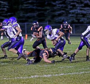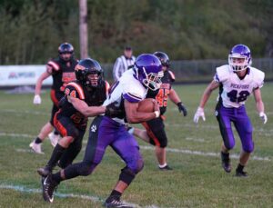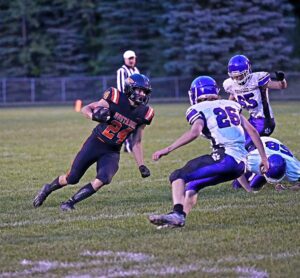 Ashton Wymer, and Erven Ludy drag Panthers down the field as Tyler Nelson takes a knee to end the Mustangs resounding win over Pickford. 54-0