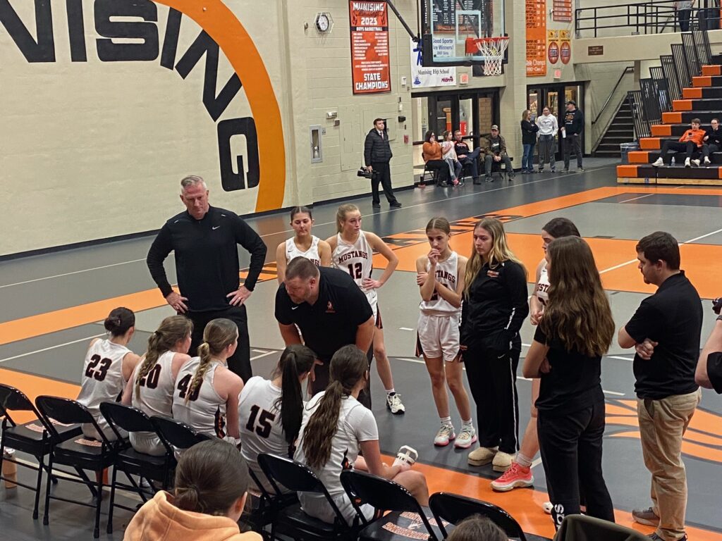 In a hotly contested game the Mustang girls fall to the Marquette Sentinels 47-50 tonight in Munising.