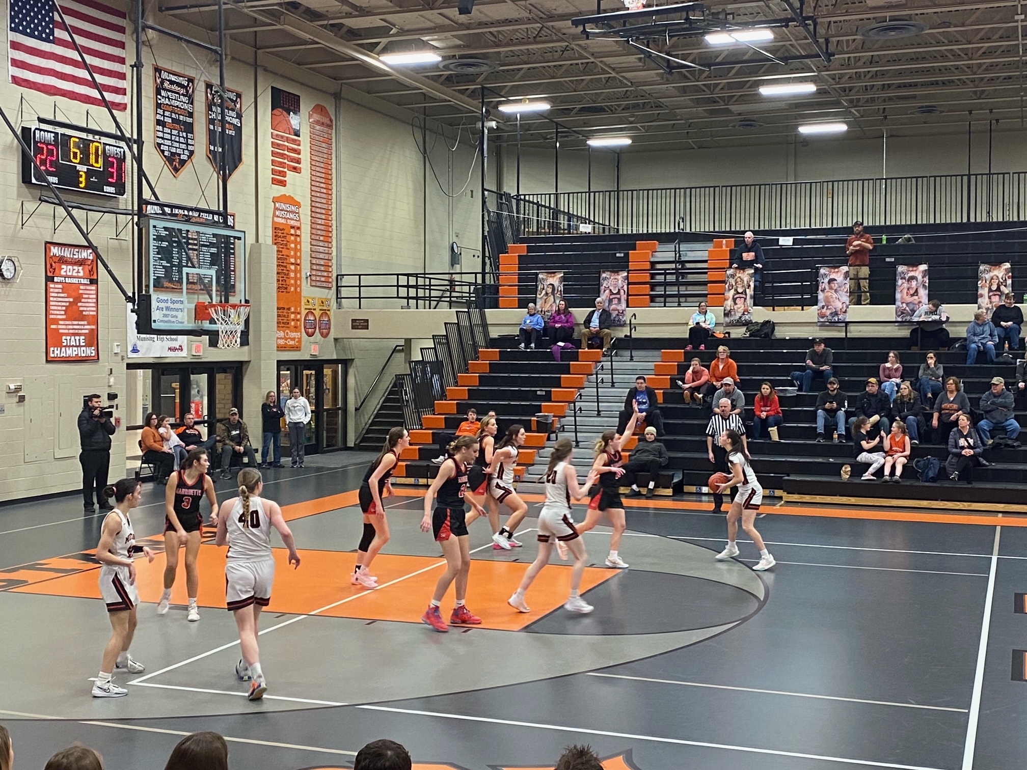 In a hotly contested game the Mustang girls fall to the Marquette Sentinels 47-50 tonight in Munising.