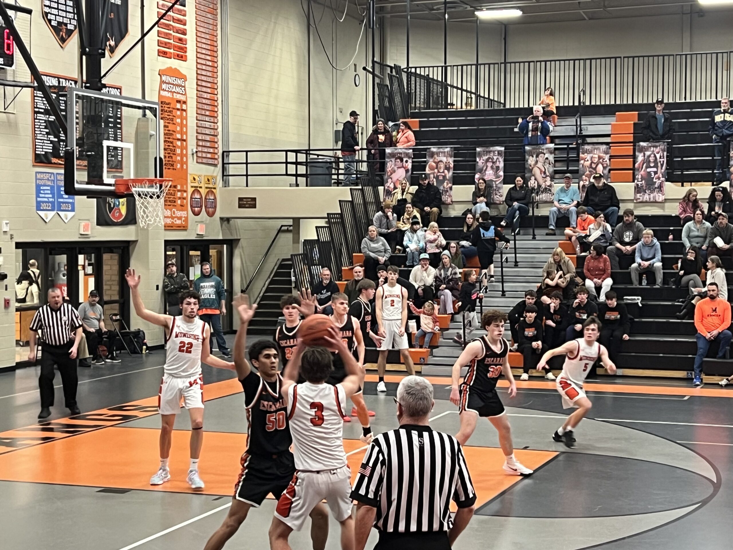 The Mustang boys dominated the Escanaba Eskymos in a raucous gym tonight in Munising, 69-38.