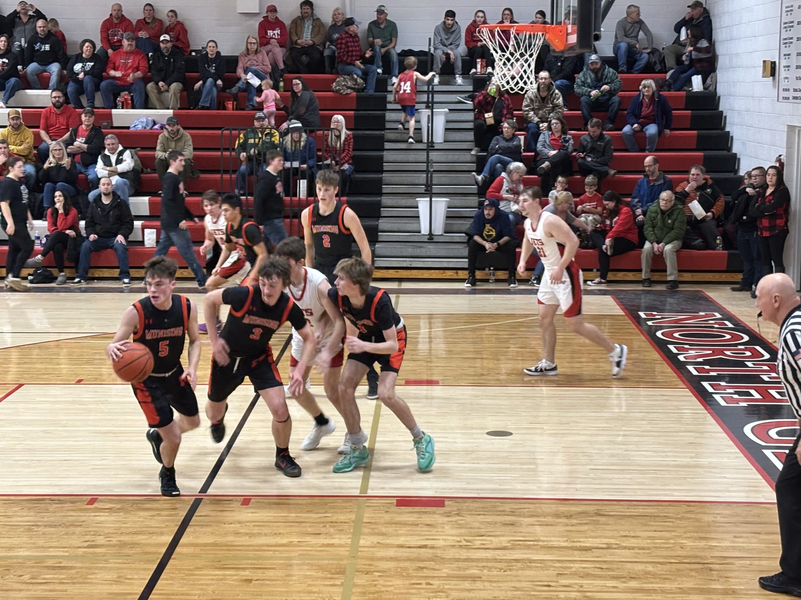 The Mustang boys shoot down the North Central Jets this evening in Powers, 54-29.